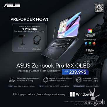 The ASUS Zenbook Pro 16X OLED comes with a three-month free subscription to Adobe Creative Cloud and is pre-installed with a lifetime license of Windows and Office 2021 apps. Pre-order the Zenbook Pro 16X OLED (UX7602) today until August 31, 2022, and get PHP15,000 worth of freebies. To know more about the pre-order mechanics, visit https://ph.asus.click/ZenbookPro16XOLEDPreOrder. The Zenbook Pro 16X OLED will be available starting September 2022 for only PHP239,995.00.