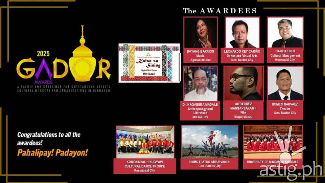 The Cultural Center of the Philippines Kaisa Sa Sining (CCP KSS) Mindanao Network names the roster of artists and culture specialists who will receive the 3rd Gador Award, a recognition for outstanding artists, cultural workers, and organizations in Mindanao. The Awarding Ceremony will take place on December 14, 2025, in Koronadal City, South Cotabato, co-presented by the CCP KSS Mindanao, City of Koronadal, and the Province of South Cotabato.