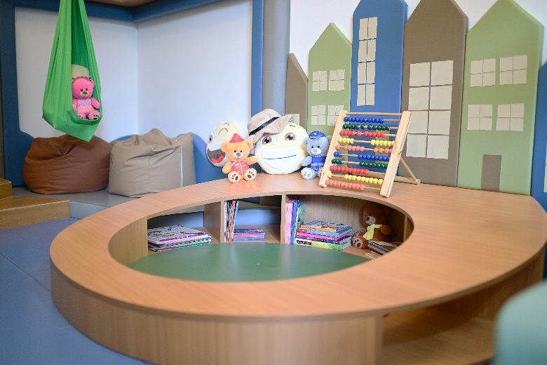 The SM Sensory Lab features a thoughtfully designed environment aimed at reducing sensory overload and providing comfort for individuals with sensory sensitivities. The space is equipped with soft lighting to minimize visual overstimulation and a quiet atmosphere to help reduce auditory triggers. Visitors can relax in comfortable seating areas furnished with soft chairs and cushions, while sensory tools such as calming toys and blankets offer tactile comfort.