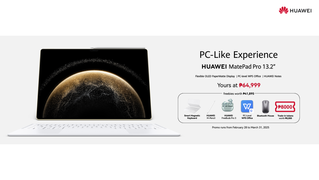 The HUAWEI MatePad Pro 13.2-inch 2025 is available for pre-order at PHP 64,999 from February 28 to March 7 through Shopee, Lazada, TikTok, the HUAWEI Online Store, and HUAWEI Experience Stores nationwide. Customers who pre-order will receive an exclusive bundle worth PHP 41,895, including a Bluetooth Mouse, Smart Magnetic Keyboard, HUAWEI 3rd Gen M-Pencil, PC-Level WPS Office, and trade-in tokens worth PHP 8,000.