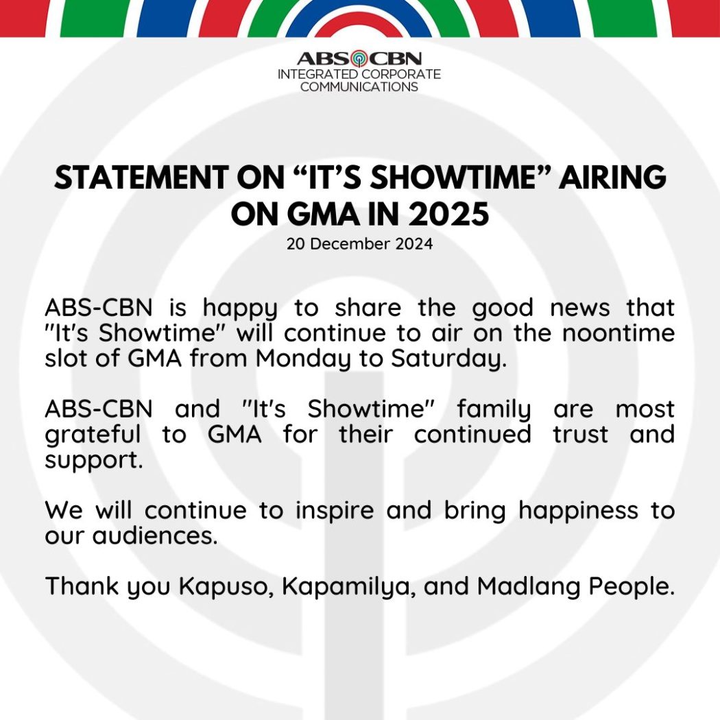 ABS-CBN has announced that its flagship noontime variety show, “It’s Showtime,” will continue airing on GMA Network starting 2025. This development strengthens the collaboration between two of the Philippines’ leading broadcast networks, ensuring Pinoy audiences can still enjoy their favorite noontime show from Monday to Saturday.