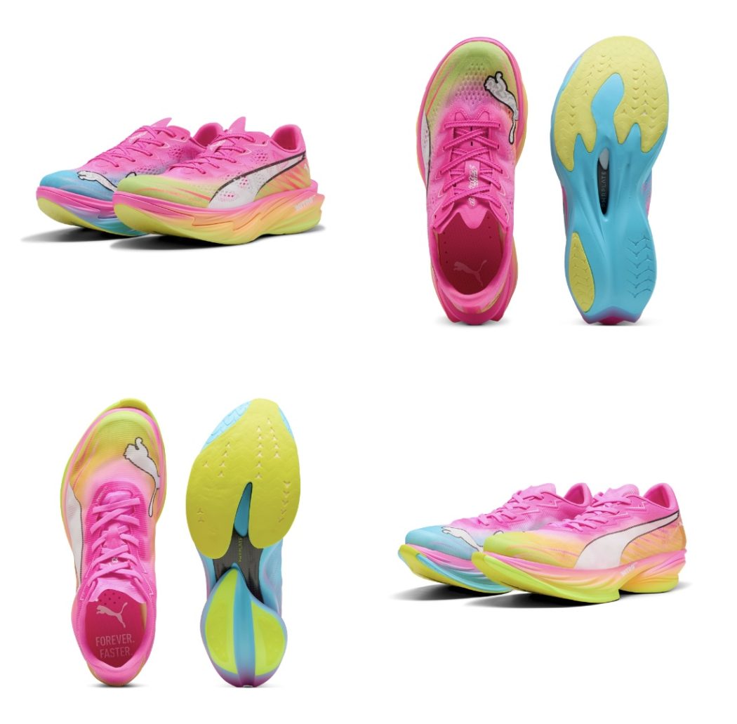 The colorways, Poison Pink-Yellow Alert-Bright Aqua-Sun Stream for the women’s model and Poison Pink-PUMA White for the men’s, are deliberately bold and consistent with the visual language typically associated with high-visibility race-day footwear.