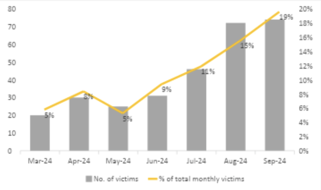 Once a dominant force, Lockbit’s recent activity has slowed significantly. Now accounting for only 5% of ransomware cases, it’s recycling previously attacked victims to maintain relevance and affiliate confidence. After a major crackdown in February 2024, Lockbit’s once extensive operations have dwindled.