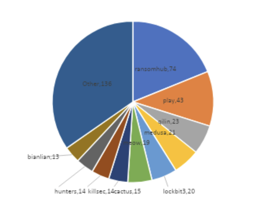 Play and Qilin (Agenda) ransomware groups show consistent activity, primarily targeting North American businesses. These groups focus on sectors like manufacturing, showing how ransomware threats vary in intensity but persist across different industries.