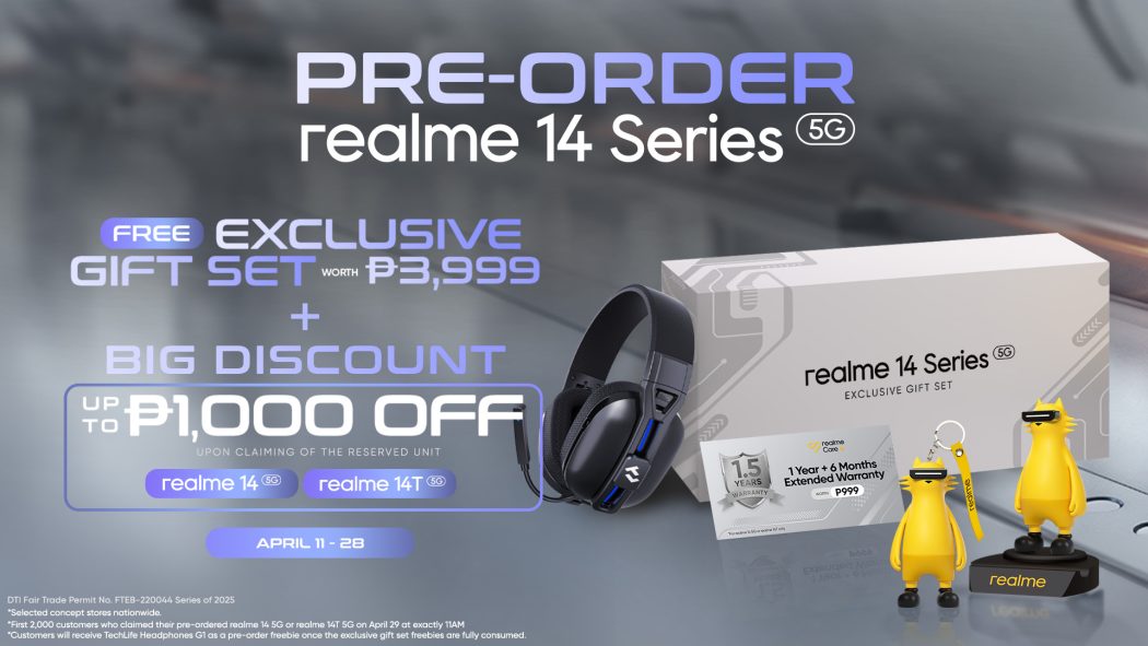 Fans can pre-order the realme 14 Series 5G until April 28. Pre-orders come with a free set of TechLife Headphones G1 (worth P2,199) and a discount of up to P1,000 upon claiming the unit.