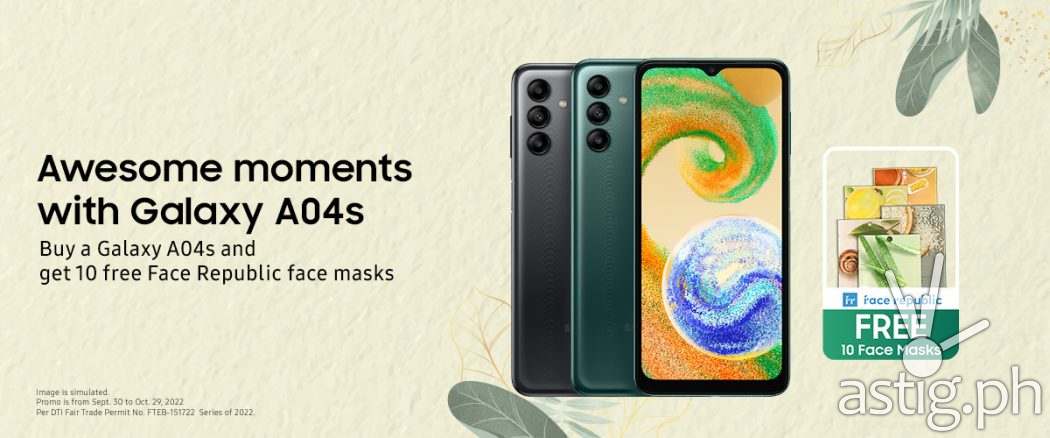 A limited promo offer is up for grabs too! Get Ten (10) free Face Republic face masks for every purchased Galaxy A04s unit from the Samsung Official Store in Shopee or Lazada valid from September 30 to October 29, 2022. The free promo items will be delivered to the customer’s address together with the purchased unit and are not convertible to cash, special discount, or any other product.