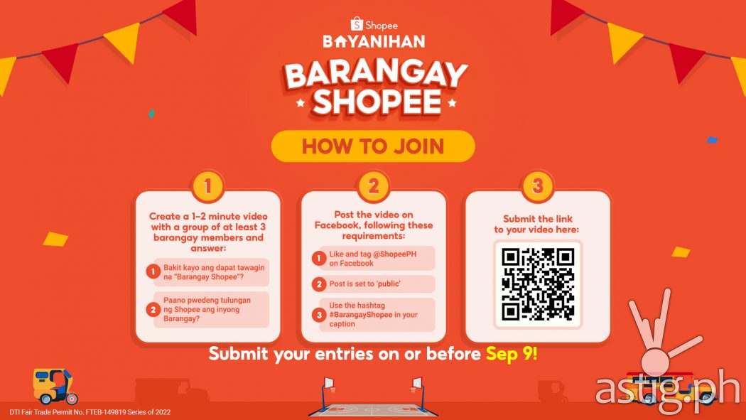 Starting August 25 up to September 9, users can join Barangay Shopee by posting video entries on Facebook and submitting the link via the Barangay Shopee page in the app. Joining the online contest can be done in three simple steps: