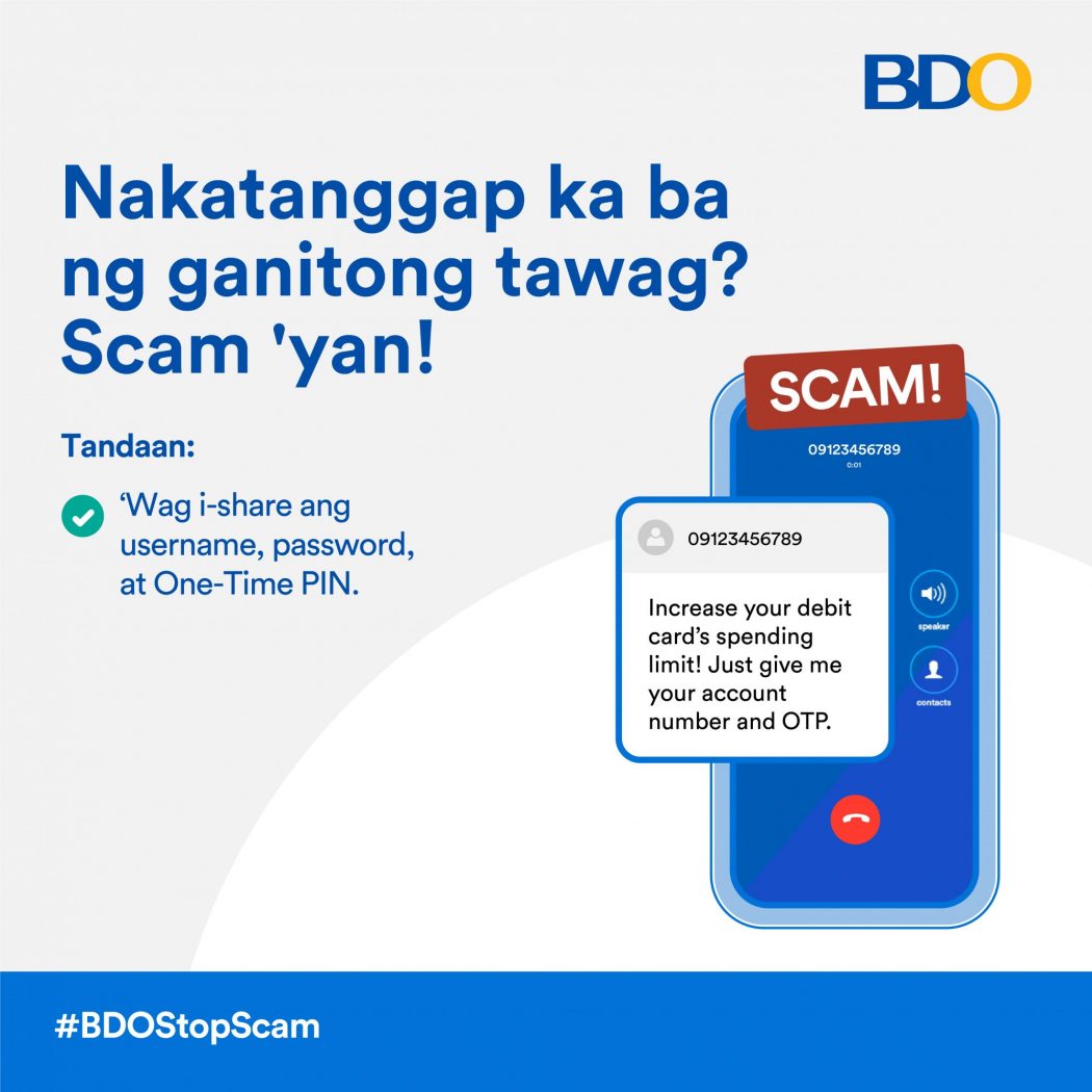 To learn more tips against scammers, clients may visit the official BDO website at https://www.bdo.com.ph for the most updated advisories. #BDOStopScam