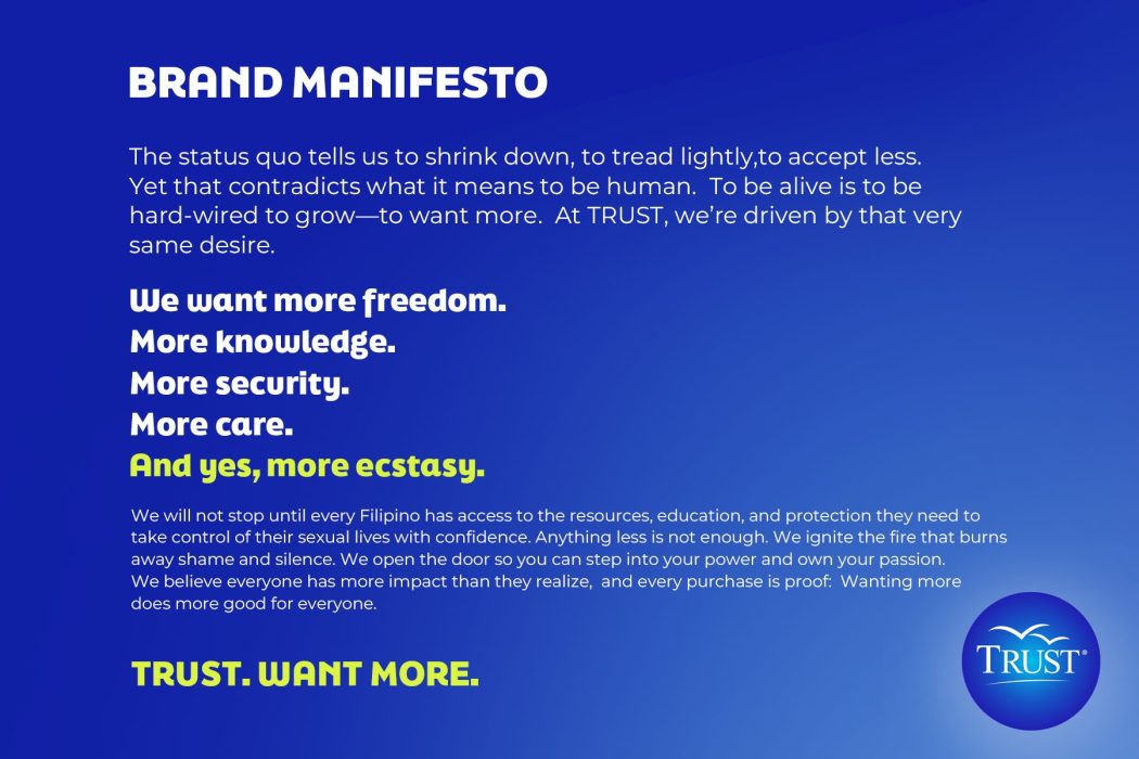 During the event, the refreshed logo, social enterprise seal, and brand manifesto were also unveiled. The manifesto serves as a declaration of TRUST’s vision for the future, affirming the brand and every Filipino’s desire to want more — more freedom, more knowledge, more security, and more care when it comes to sexual health choices.