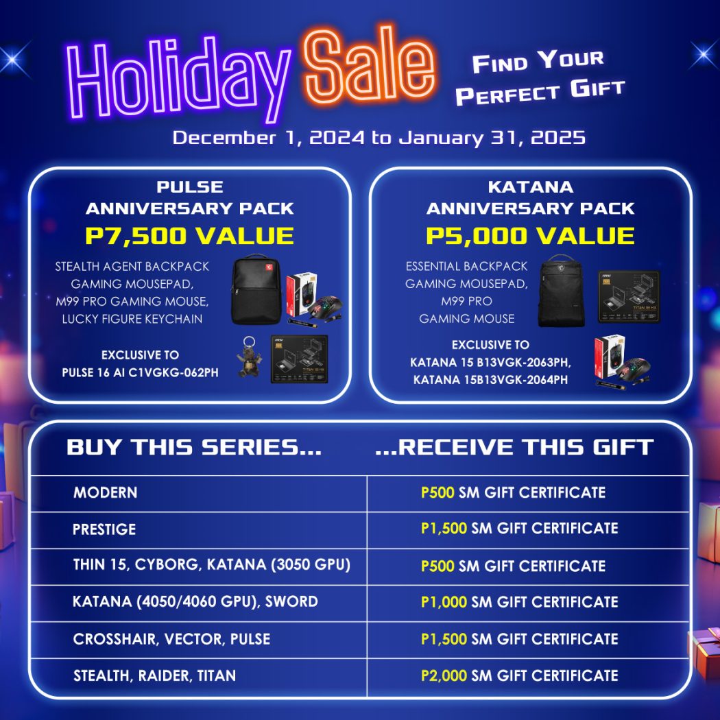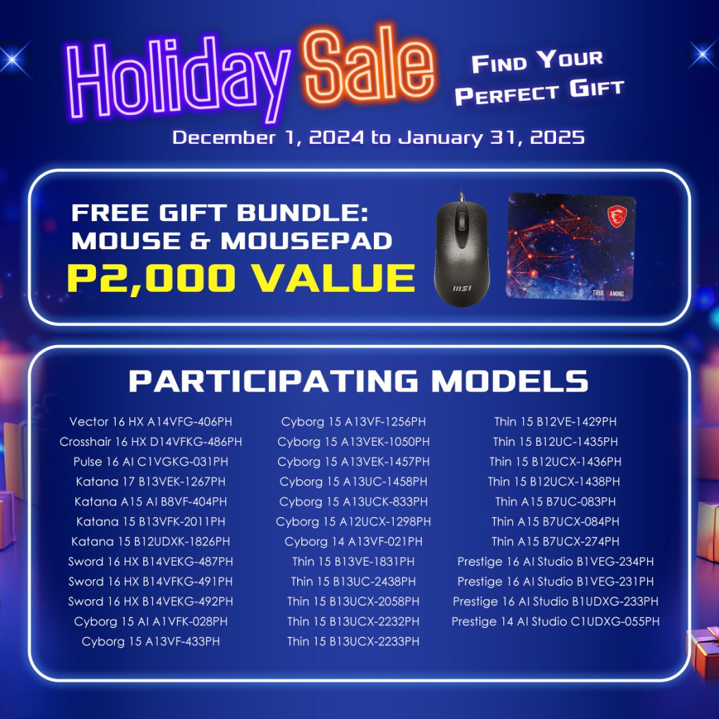 MANILA, Philippines – With the holiday season fast approaching, MSI Philippines has announced a special promotion offering discounts of up to 28%, along with exclusive freebies and SM vouchers. Running from December 1, 2024, to January 31, 2024, this deal is perfect for those looking to upgrade their gadgets or find the perfect gift for loved ones.