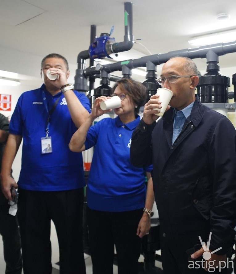The Rainwater Treatment Facility at SM City Baguio Baguio City Mayor Benjamin Magalong (right) samples the potable water from the SM Baguio rainwater treatment facility with SM SVP for Marketing Joaquin San Agustin (left) and SM VP for Corporate Compliance Engr. Liza Silerio (center).